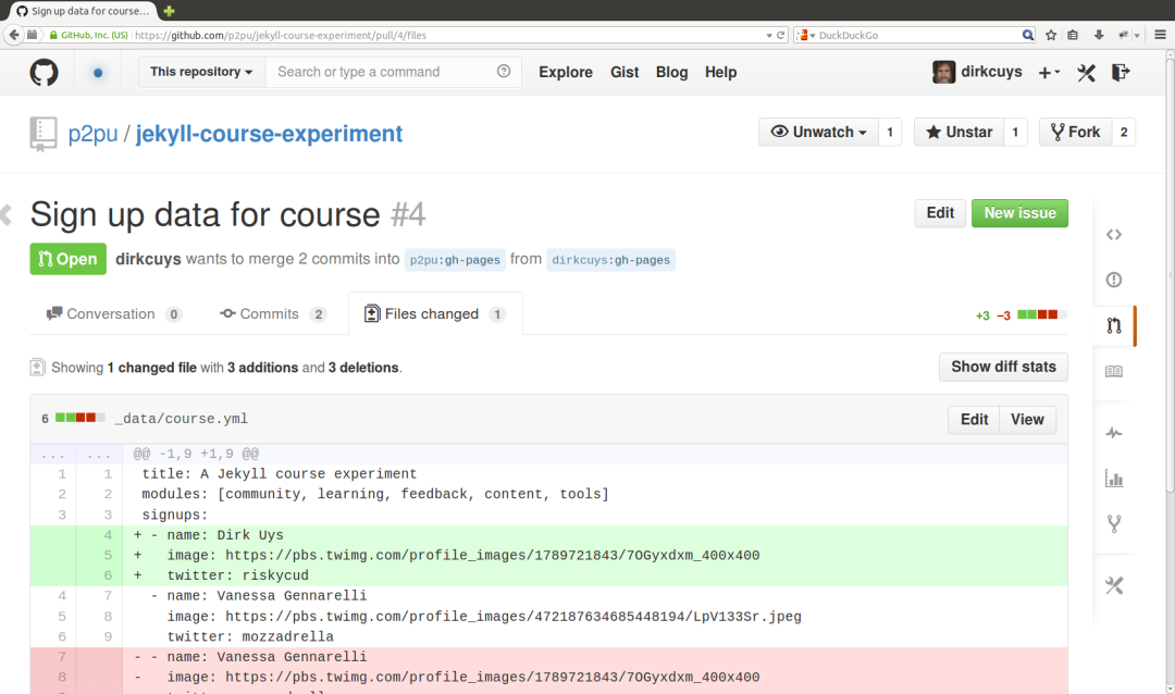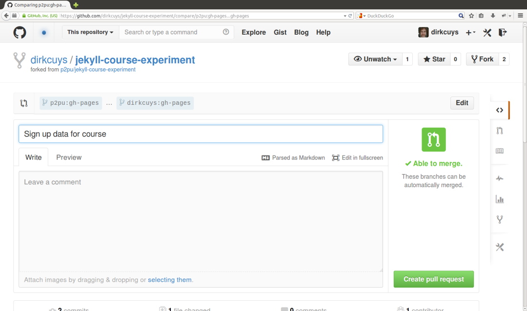 To submit a pull request, go to a repository that you forked. Ex. "https://github.com/yourusername/repositoryname/"