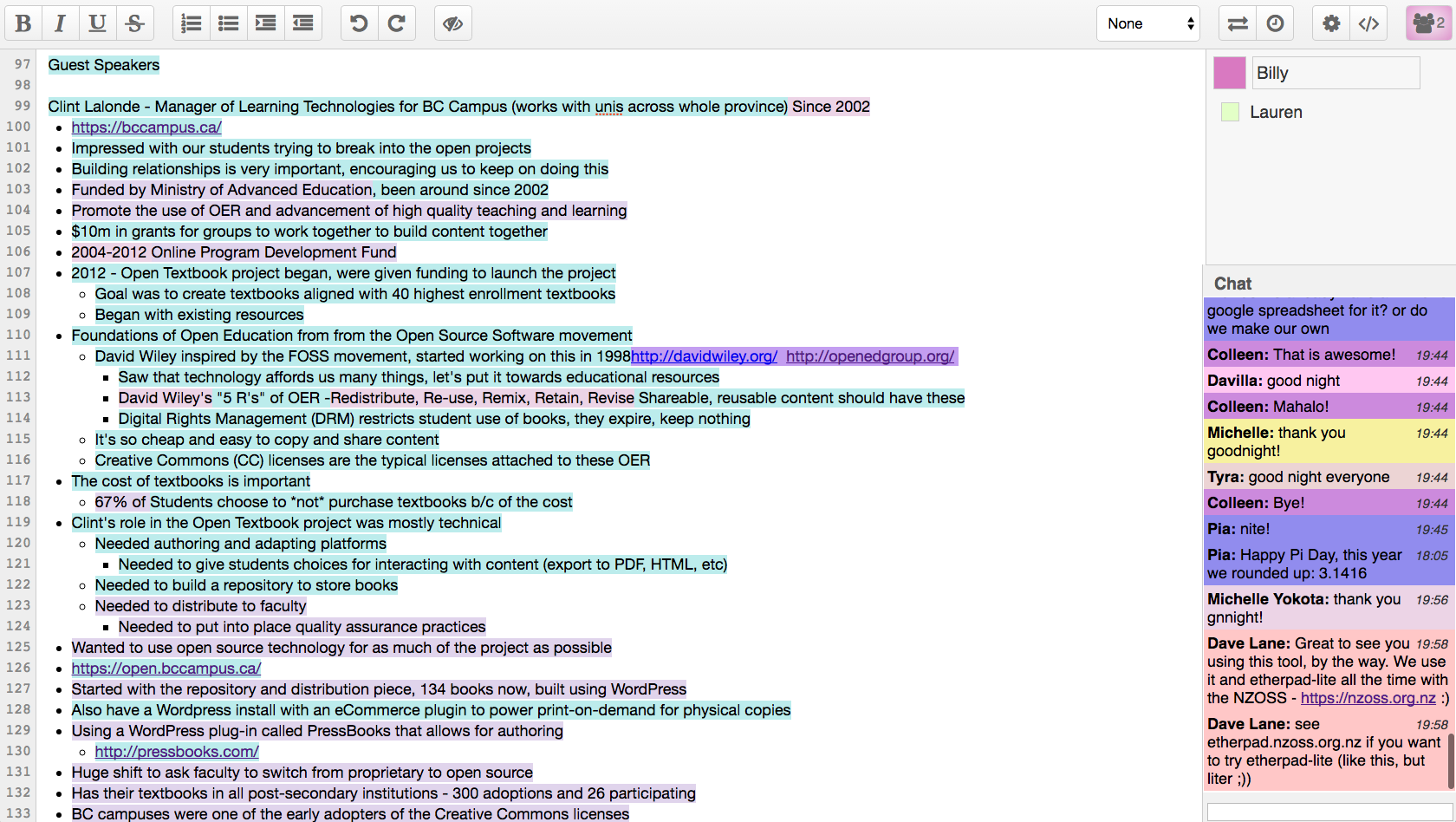 As is typical for many open projects, I started an Etherpad document (Mozpad, actually) to record class session notes. This was one of the biggest changes for students in my course, as they had not participated in collaborative note-taking before. Share notes…what the heck? Aren’t we all supposed to scratch down our own notes and not share them? Are we gonna get in trouble for this? Nah, it’s called working open, guys. As a side note, Mozpad doesn’t appear to be very friendly for folks who use screen readers. Still, all the students were able to take part and build a history of the synchronous class sessions that they could all reference as the course progressed.