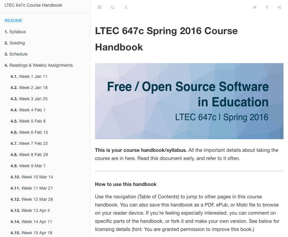 Gitbooks.io is a pretty amazing tool. It’s a simple way to organize text documents (markdown, actually) into a book-like format, with pages, chapters, links, images, and that’s about it. But other tools offer those “features,” too, ya? Of course. But do the other tools offer version control, forking, and annotation on top of the curriculum? Not as likely. With Gitbooks, students could at any time see the latest changes to the course, see comments/annotations left by other students, and download a copy of the full course content in a variety of formats. The course “handbook” (as I called it) was a living document, setting it apart from most online courses, and it was synced to a Github code repository through Gitbooks. As students caught small errors (which they did) and made suggestions for other readings and interesting material supporting the course topics, they could drop them right into the page. I didn’t end up adding any students as “collaborators” on the course handbook, but they could easily fork it and/or take it with them at any time, in a format that will open on almost any device. Try to do that with your LMS.