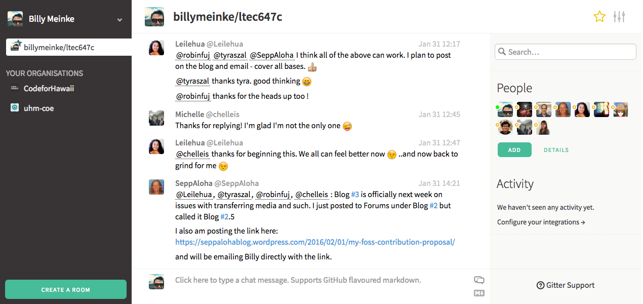 I set up a Gitter chatroom for the course, but I’ll admit that it didn’t have the same uptake with students as I had wished. Some discussion happened there, and the chatroom remained open as a way students could contact me (and the whole class) at any time, but after a while the room stagnated and students stopped chatting there. I imagine Gitter might be a more useful tool if updates (also called integrations) to the course content were fed into it as they are typically done when Gitter is used for coding projects. I’ll have to look at this tool again down the road and see if there’s a way to support more ongoing, lively discussion. To its merit, Gitter has a nice, simple web interface and mobile apps for iOS and Android - And I was able to get notifications when students had immediate needs that were suitable for display to the whole class.