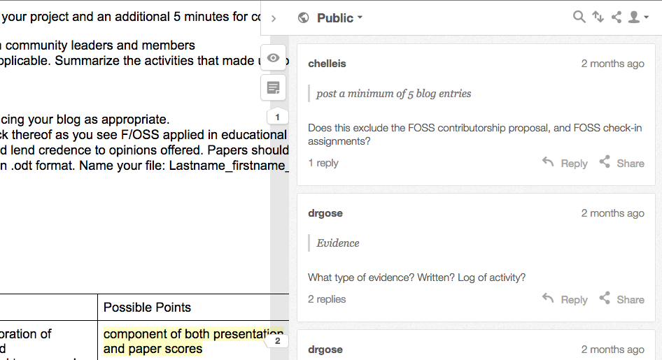 The educational applications of the Hypothes.is open annotation tool are just being discovered now, but I had a specific use case in mind for this course. The final project in the course involved students volunteering on FOSS project, offering their time to work on documentation, visuals, translations, and other non-programming tasks for open projects. Their experiences were to be written into a paper and presented during the final class sessions, and the assignment description and rubric was held in a PDF. But that wouldn’t do. So I scraped the content from the PDF, moved it into a Google doc, published it to the Web, and added a link to via.hypothes.is so that students could annotate it without having to install any software locally. Have a question about the grading criteria? Annotate it and let me know. Are the instructions a little hard to understand in some sections? Mark it up and let’s discuss. I announced an open period to annotate the final project description and rubric, after which the students were tied to the document. It was a “speak now or forever hold your piece” sort of situation, and Hypothes.is provided the means for open discussion about the project that would dictate a huge chunk of their course grade. I’ll be doing activities similar to this in the future.