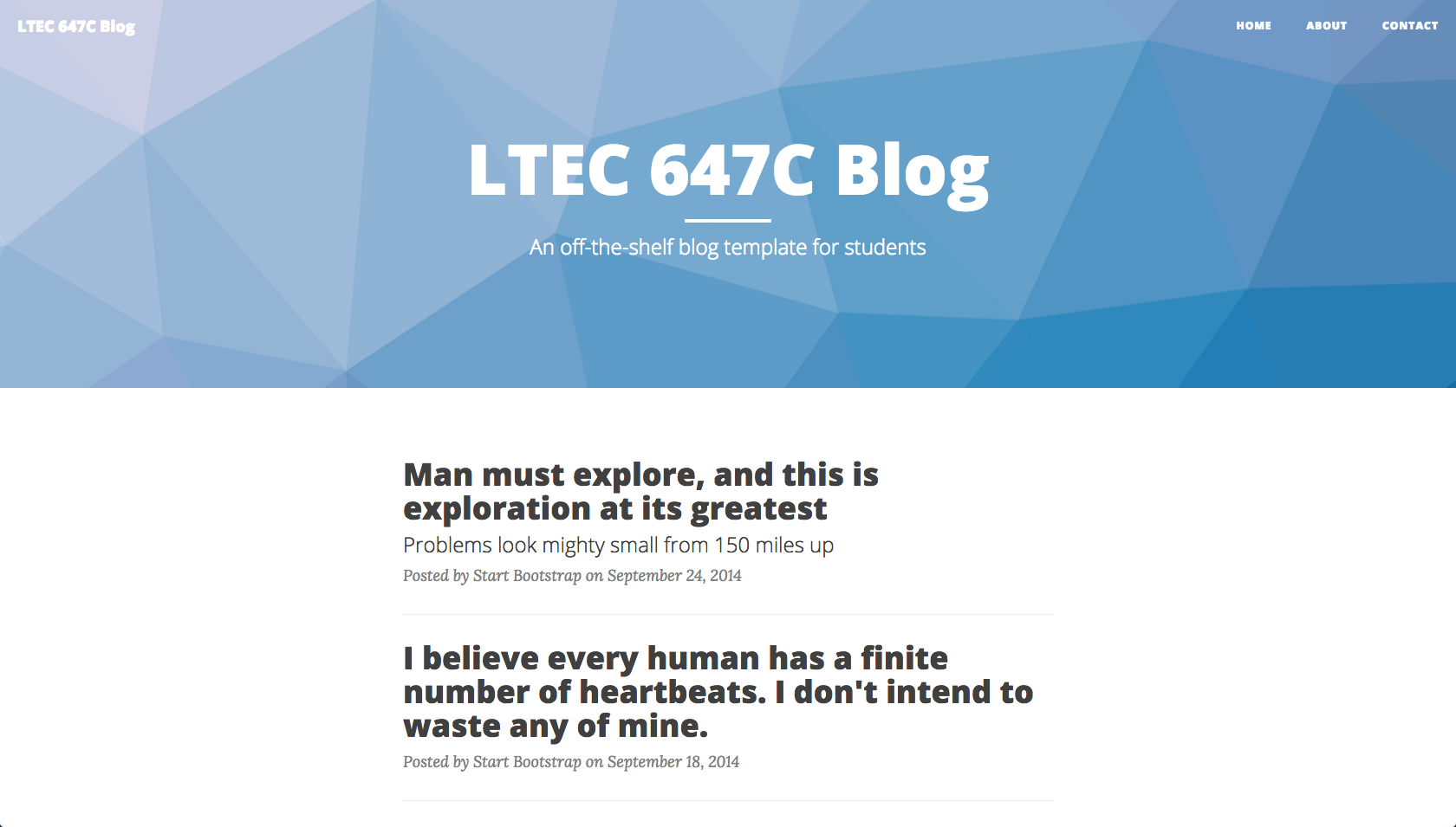Instead of Wordpress.com, I did anticipate (incorrectly) that some students would be willing to give a Jekyll/Github Pages blog a shot. The idea of blogging out in the open was on its own quite an idea for students to wrap their heads around, and working with a little bit of code was too much. No students ended up using this method to set up a blog, although I did create a boilerplate blog in case the next students are willing to give it a go.