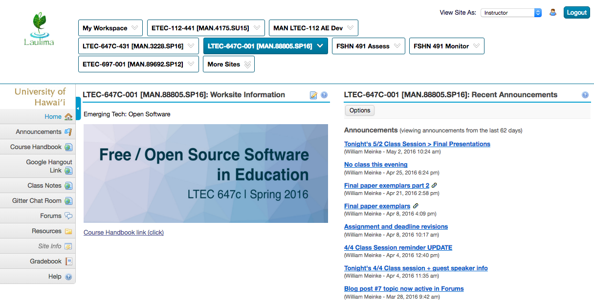 I must admit that there wasn’t a clear way around using the university-supported LMS for some things. I used Laulima (our version of Sakai) for announcements, student assignment submissions, and the gradebook. There are just some things that need to be carefully managed and protected, so for this reason I still returned to our local LMS. I expect I’ll have to do this for some time, even if I scale back my use further.