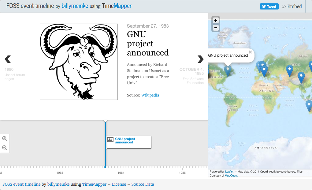 One collaborative assignment involved the student building a timeline of events in FOSS (and open, more generally) history. TimeMapper made it easy to create a spreadsheet with the proper column headings and make it feed a pretty, interactive timeline. Once the Google spreadsheet (arguably not all that ‘open’) was created, students could jump in an add their three to five events to the timeline, which was updated in realtime. This work will be continued for the next iteration of the course, of course.